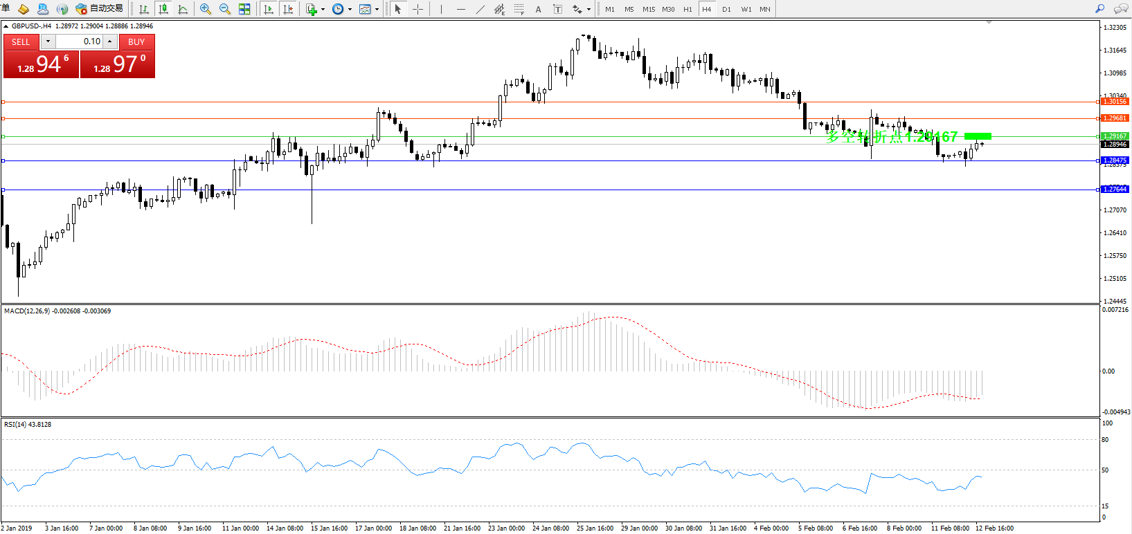 交易策略:1.29167下方看跌,目标1.28475、1.27644