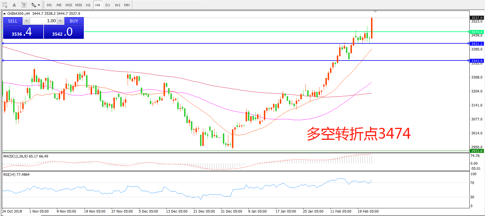 4小时图看,CHINA300中华指数突破阻力后强势上行。光头光脚阳线收盘,整体走势十分强势,均线系统呈多头排列, MACD红柱增加,整体维持偏多思路。
