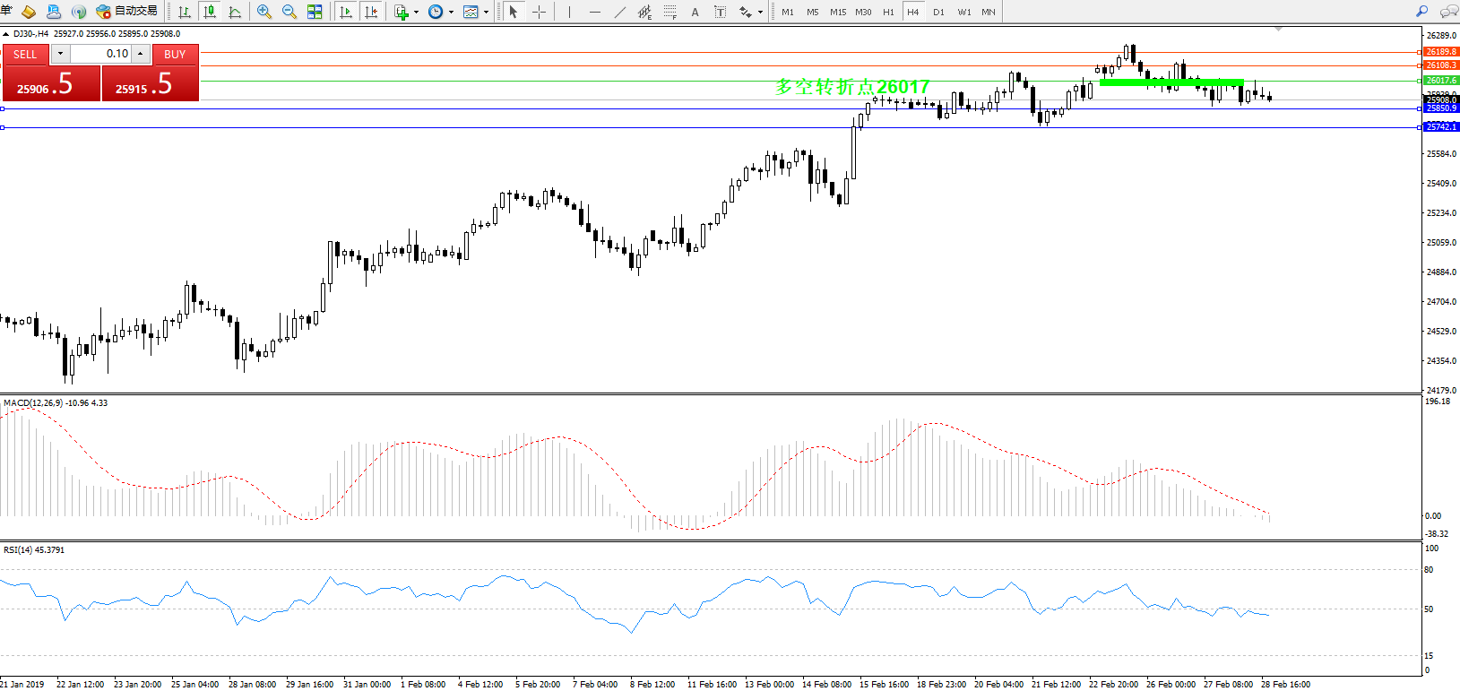 美国股市在昨日星期四走低,其中基础材料、石油和天然气和科技等下跌的板块带领股指走低。道琼斯工业平均指数跌69.16点,跌幅0.27%,报25916.00点,2月份累涨约3.67%1-2月累涨约11.10%。道指1-2月表现创1987年以来同期最佳。美国四季度GDP回落至2.6%,全年增速跌破3%但创2015年来最高。