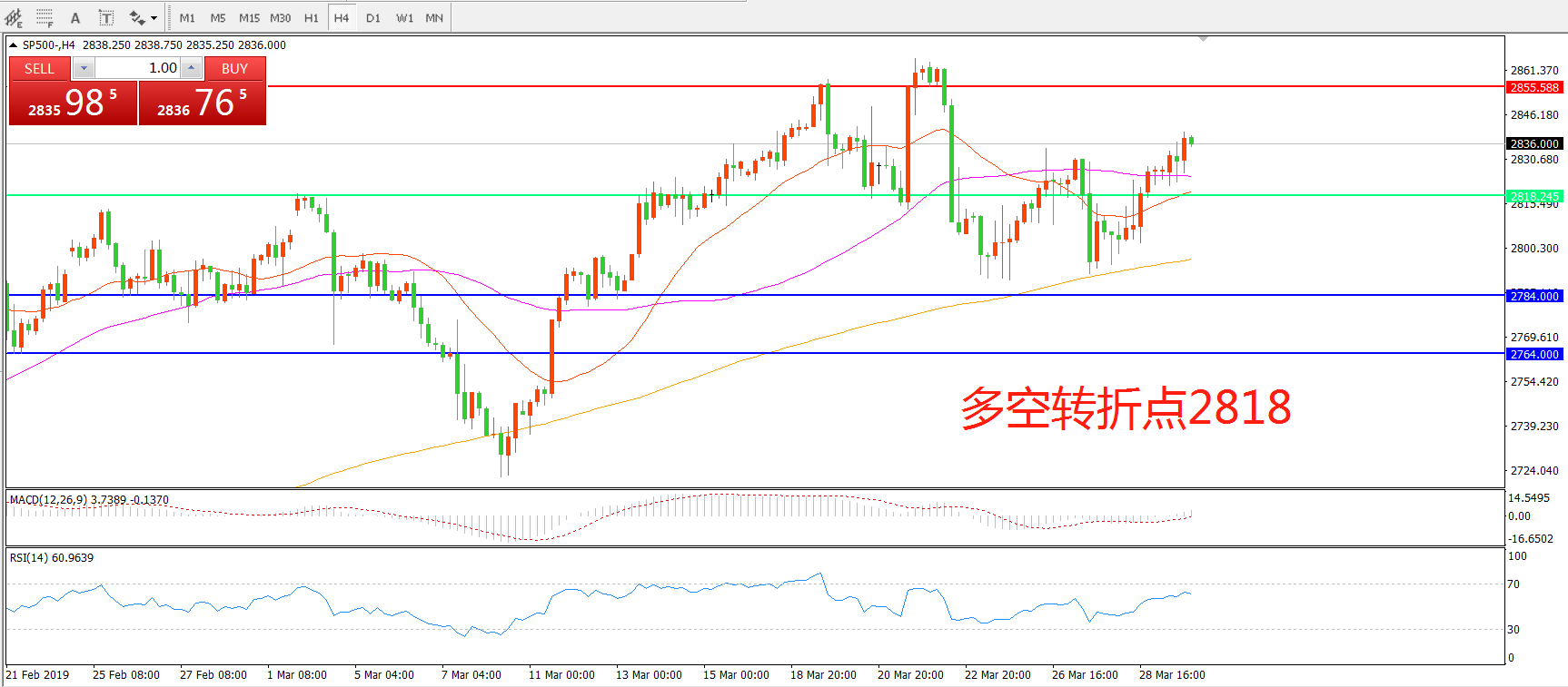 4小时图看,标普500以200均线为依托逐阶上行,短期均线向上拐头,有形成金叉迹象,MACD红柱增加,RSI拐头向上,日内走势震荡偏多。