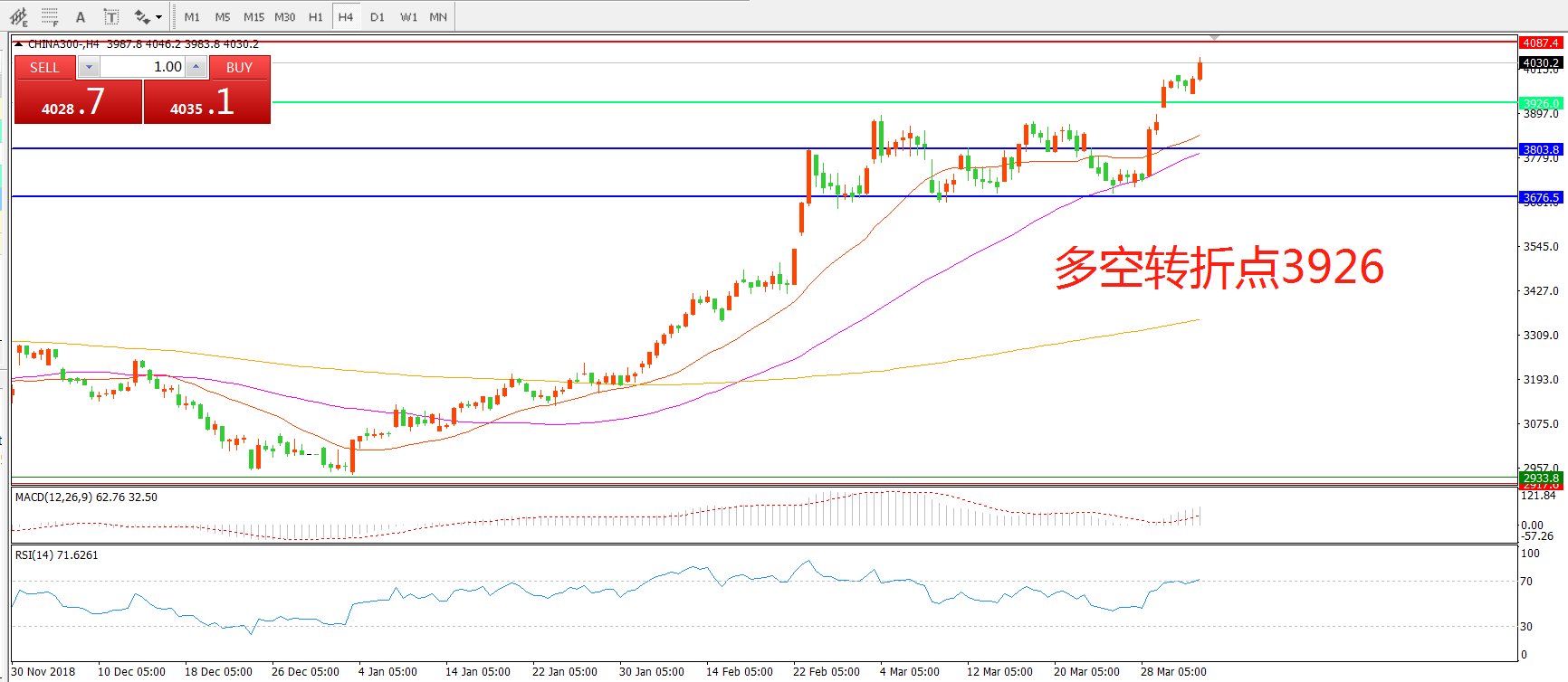 4小时图看,中华指数CHINA300以55均线为依托,强势上行,整体涨势不改。 MACD红柱增加,RSI指标拐头走平,多头趋势依然明显,日内延续上升概率较大。