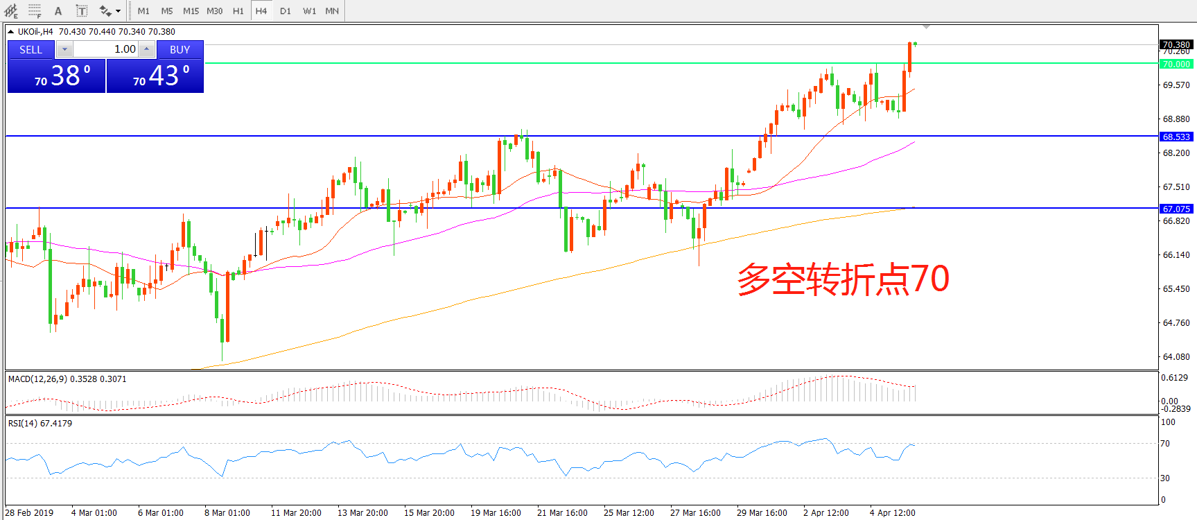 4小时图看,油价强势突破70美元,短期走势偏强,均线系统呈多头排列,MACD红柱缩短,RSI指标走平,日内延续上行概率较大。
