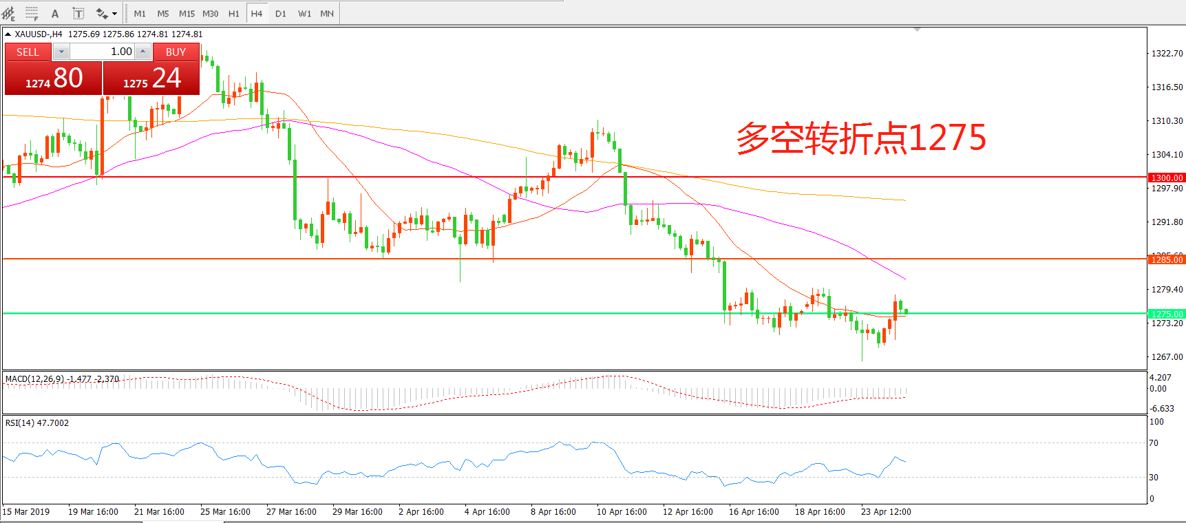 4小时图看,金价长针探底后震荡回升,勉强收复1275关口,短线企稳。但整体依然处于明显的空头形态中,MACD绿柱缩短,RSI指标拐头向下,日内延续弱势震荡概率较大。