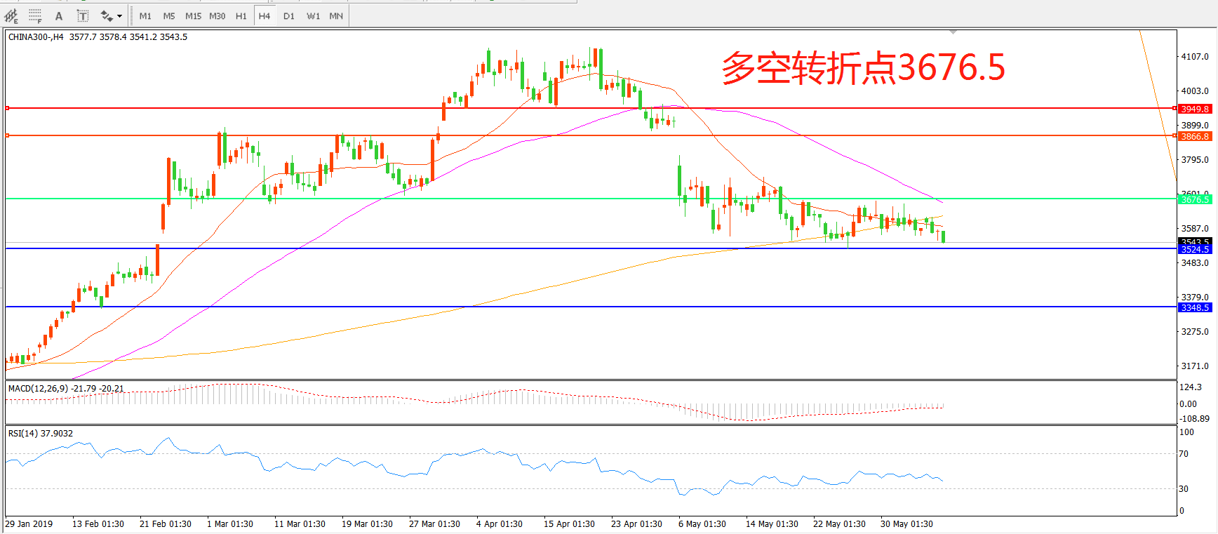 4小时图看,沪深300指数在跌破3676.5后陷入弱势震荡, 短期走势依然偏空MACD绿柱缩短,RSI指标拐头向下,近期以震荡下行思路对待。