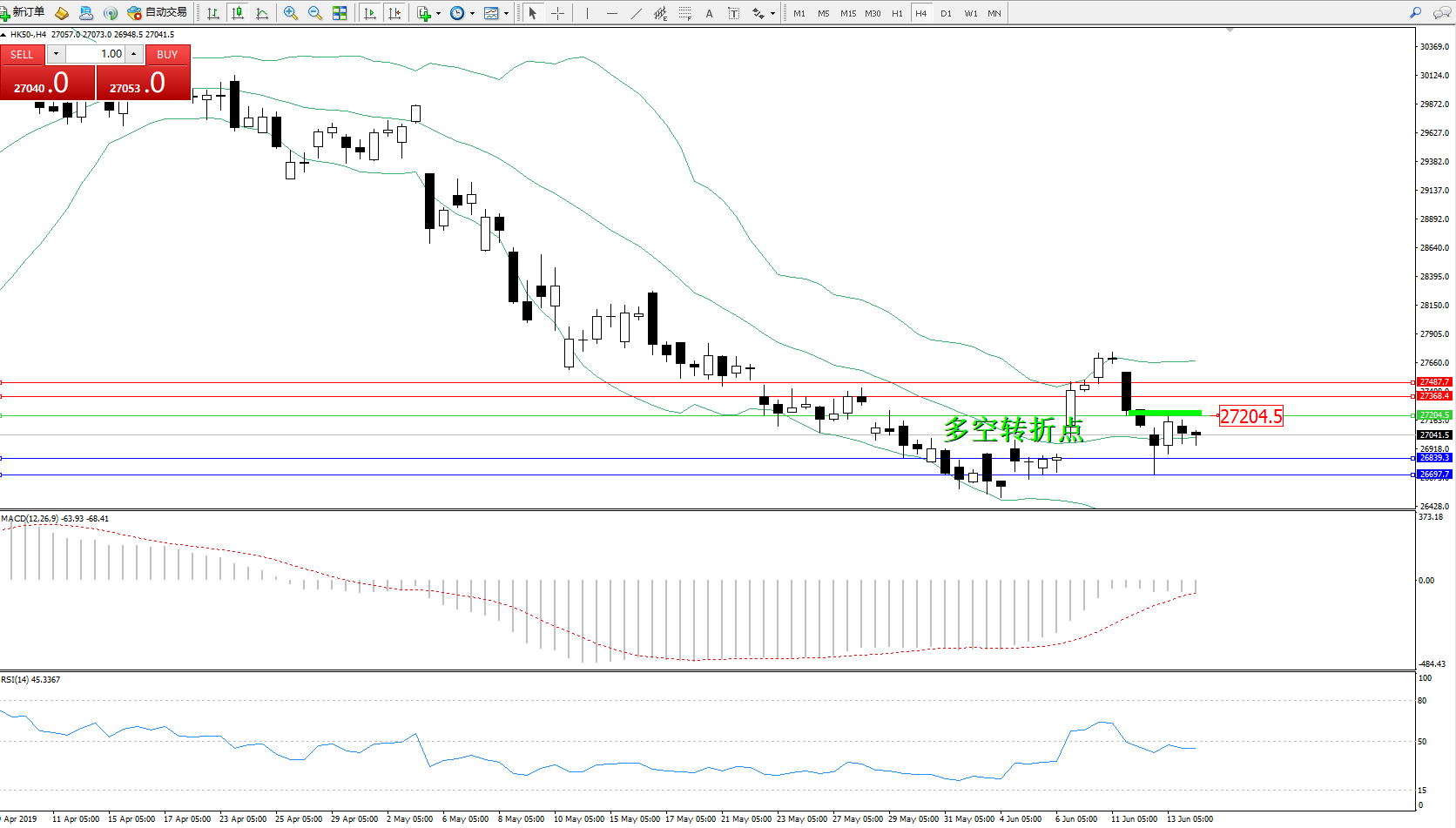 香港恒生指数6月14日(周五)收盘下跌176.36点,跌幅0.65%,报27118.35点;港股未有跟随外围造好,低开113点,再扩大跌幅,最多跌199点,恒指低见27095,再次迫近27000关口。内地中证监,在陆家嘴论坛上主持上海证券交易所内之创科板开板仪式。并表示两个月后,首批企业将会上市。中证监同时公布多项对外开放措施,包括修订合格境外机构或投资者。以进一步放宽,更容易地参与国内金融市场。
