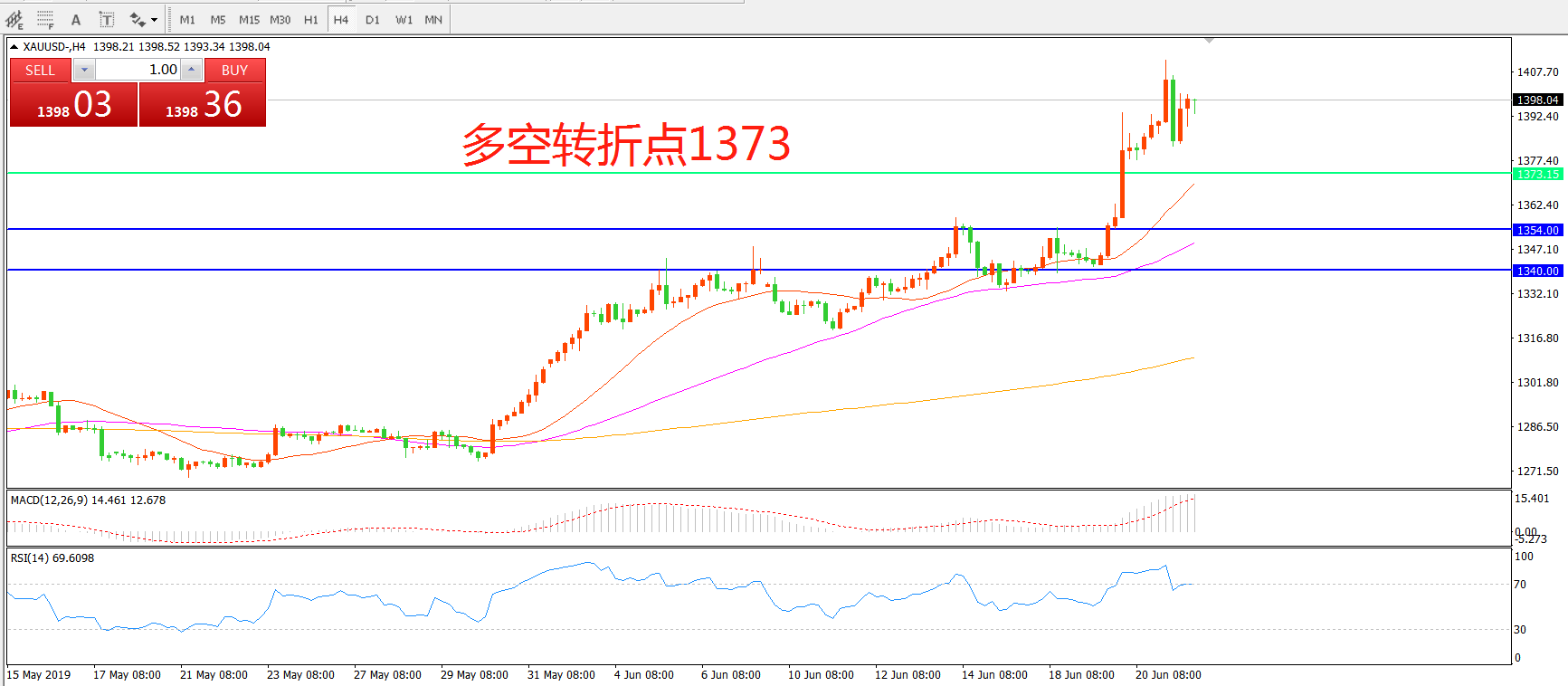 4小时图看,金价冲破1400后小幅回落,但整体依然处于多头形态之中。均线系统呈现多头排列, MACD红柱缩短,RSI指标走平,整体思路依然以做多为主。