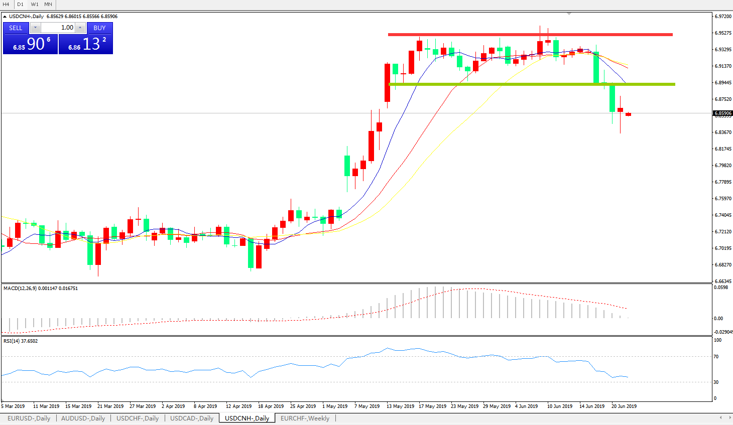 技术面简析:日线图均线发散下行,MACD逼近0轴且动能柱几无量能,RSI逐步走低,在贸易争端缓解及G20乐观预期推动下,汇价大概率将进一步走低。