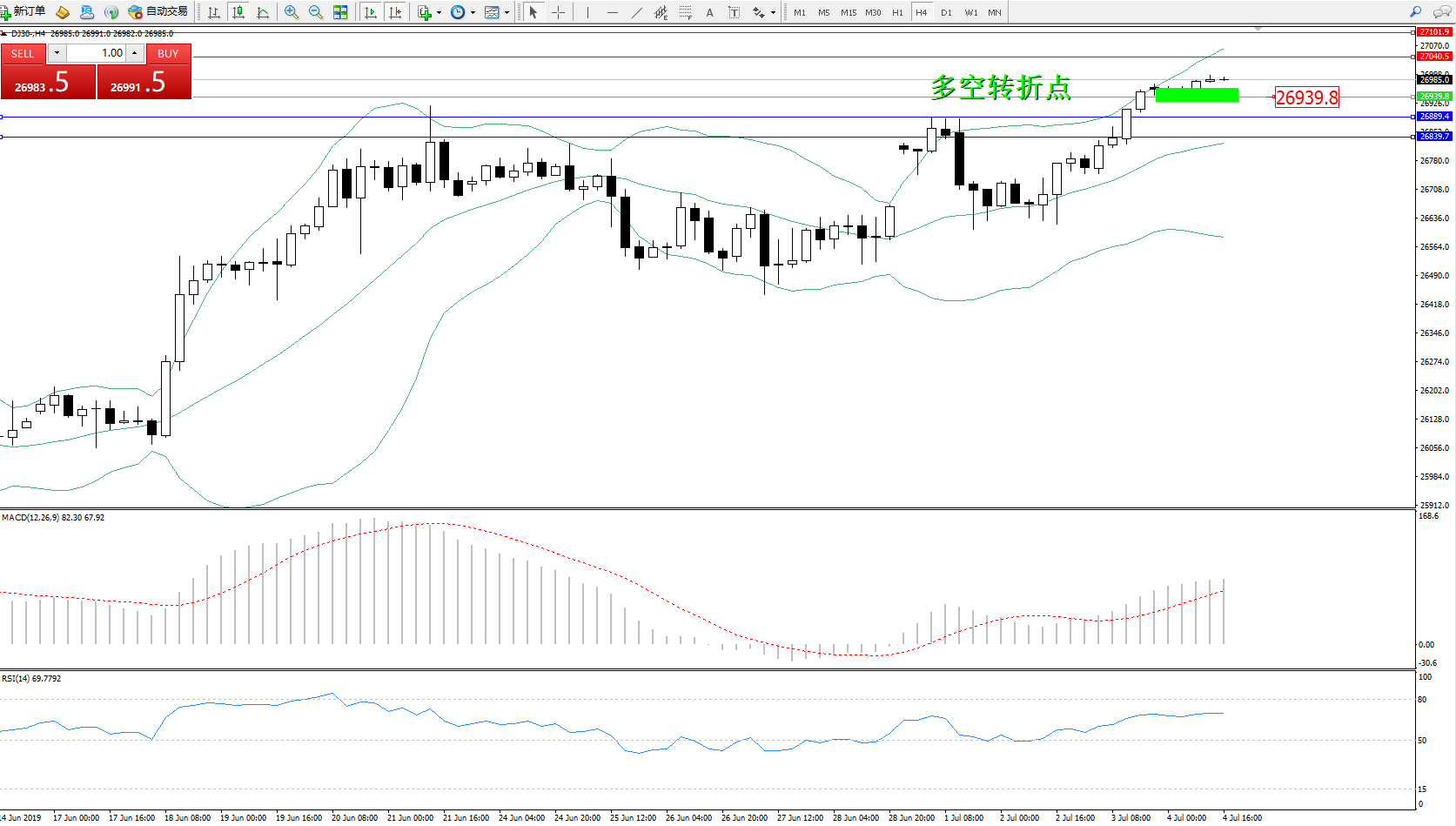 道琼斯指数收涨179.32点,涨幅0.67%,报26966点。美股因独立日休市一日,美国股市周三上涨,三大主要股指均收于纪录高位,6月ADP就业报告疲软引发了对周五非农就业报告较弱的一些预期。美国5月份工厂订单也低于预期,而6月份ISM服务业指数降至2017年6月以来的最低点。经济普遍恶化的势头已蔓延至劳动力市场。即使贸易现状改善,但至少从目前的情况来看,就业增长放缓的迹象应该仍足以说服美国美联储在7月或9月降息,但降息50个基点的预期似乎是有些过度。市场预期美联储政策立场将更趋鸽派。