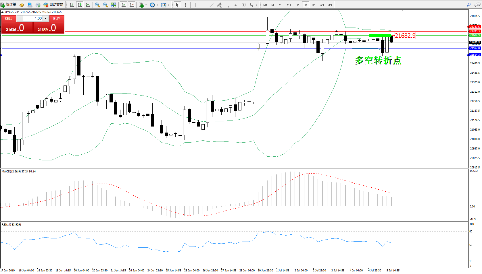 日经225指数7月5日(周五)收盘上涨27.55点,涨幅0.13%,报21730.00点。日经维持窄幅整理,缺乏进一步利好催化,短期难有所突破料继续整固,市场依旧预期当局将会减息,有关贸易谈判重启的利好消息已初步被市场消化,投资者亦会观望未来贸易谈判进程。