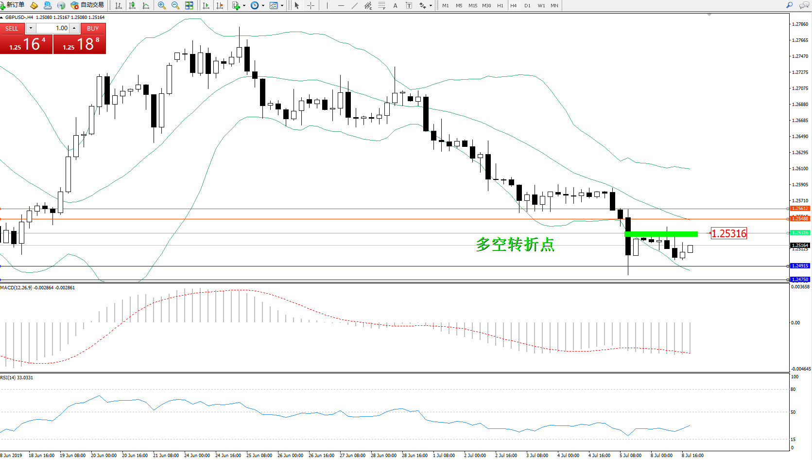 交易策略:1.25316下方看跌,目标1.24915、1.24750