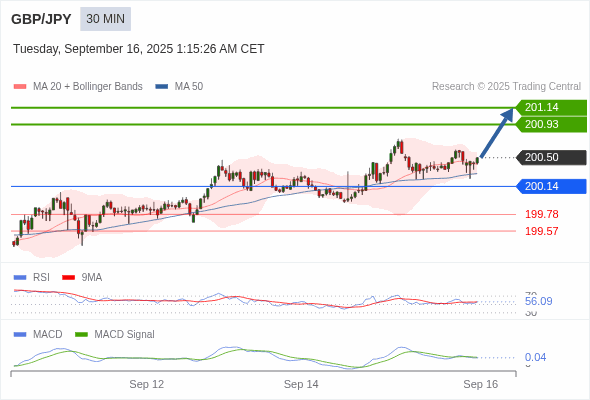 英镑/日元 当日内 : 看涨,当 200.14 为支撑位,目标定在201.14。