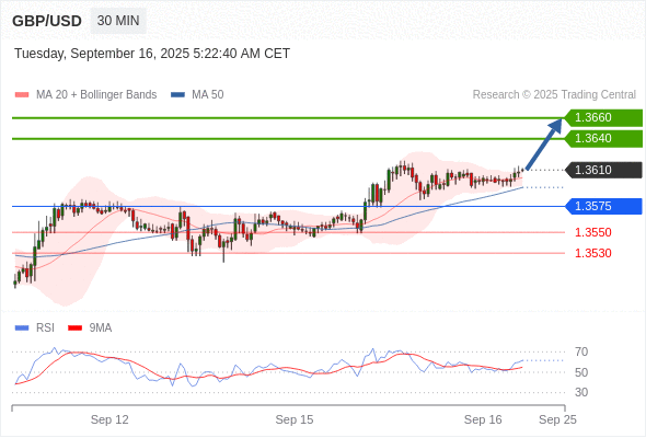 在 1.3575 之上,看涨,目标价位为 1.3640 ,然后为 1.3660 。