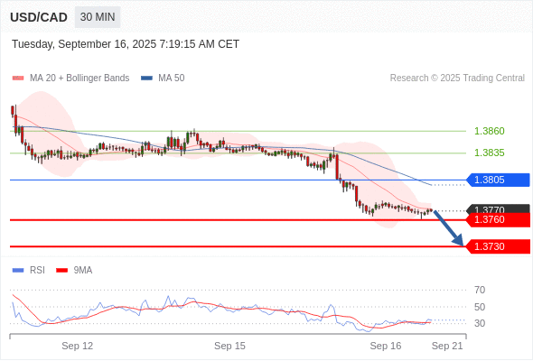 在 1.3805 之下,看跌,目标价位为 1.3760 ,然后为 1.3730 。