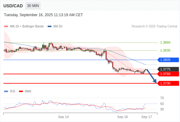 在 1.3805 之下,看跌,目标价位为 1.3760 ,然后为 1.3730 。