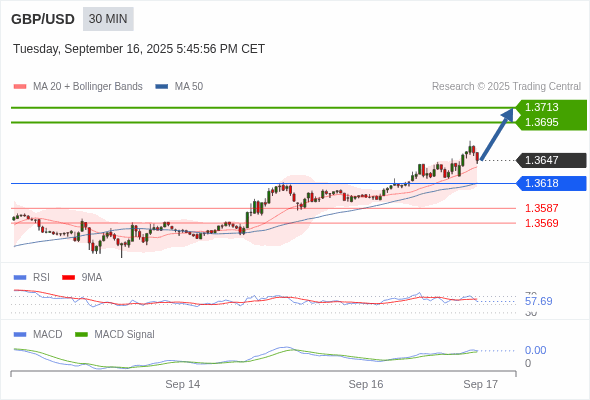 英镑/美元 当日内 : 看涨,当 1.3618 为支撑位。