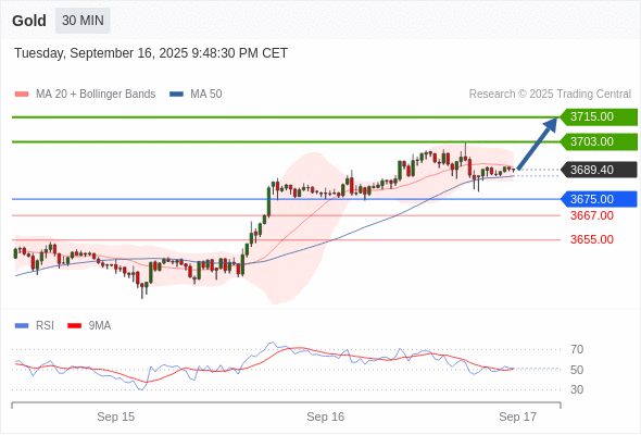 在 3675.00 之上,看涨,目标价位为 3703.00 ,然后为 3715.00 。