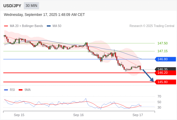 在 146.80 之下,看跌,目标价位为 146.20 ,然后为 145.80 。