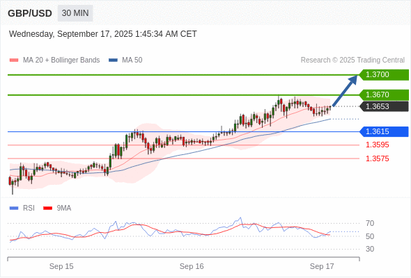 在 1.3615 之上,看涨,目标价位为 1.3670 ,然后为 1.3700 。