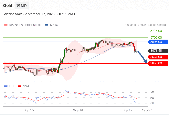 在 3695.00 之下,看跌,目标价位为 3667.00 ,然后为 3655.00 。
