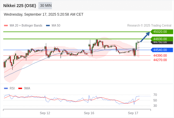 在 44540.00 之上,看涨,目标价位为 44830.00 ,然后为 45020.00 。