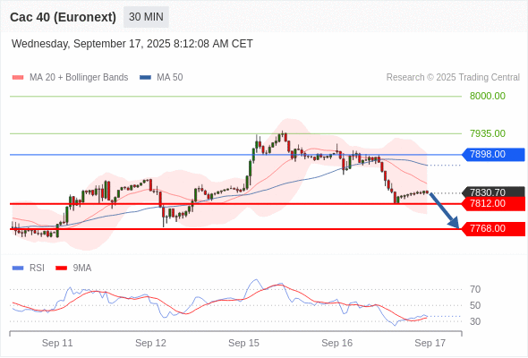 在 7898.00 之下,看跌,目标价位为 7812.00 ,然后为 7768.00 。