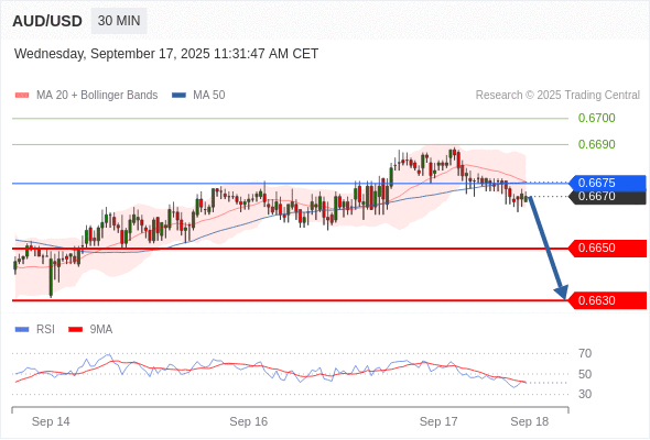 在 0.6675 之下,看跌,目标价位为 0.6650 ,然后为 0.6630 。