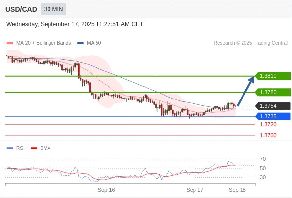 在 1.3735 之上,看涨,目标价位为 1.3780 ,然后为 1.3810 。