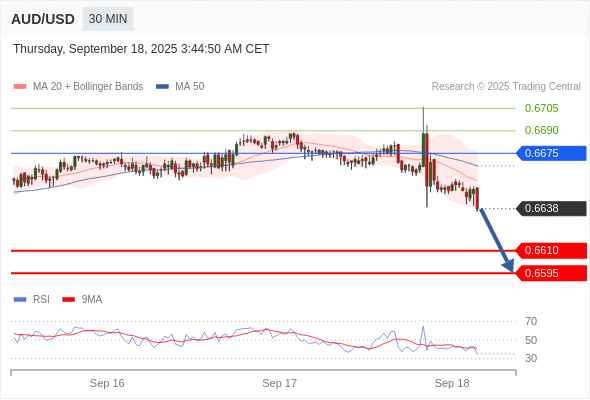 在 0.6675 之下,看跌,目标价位为 0.6610 ,然后为 0.6595 。