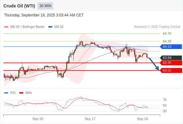 在 64.10 之下,看跌,目标价位为 63.35 ,然后为 63.00 。