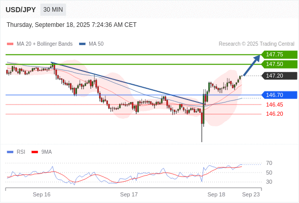 在 146.70 之上,看涨,目标价位为 147.50 ,然后为 147.75 。