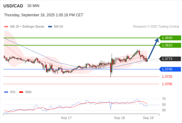 在 1.3745 之上,看涨,目标价位为 1.3810 ,然后为 1.3830 。
