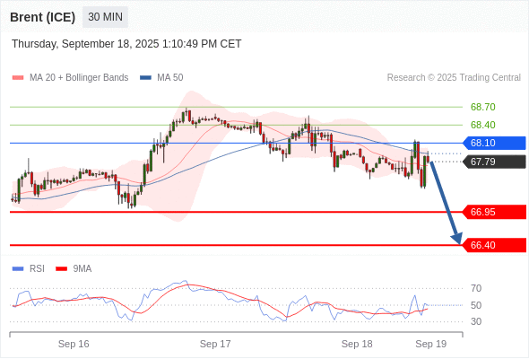 布伦特原油 (ICE) (X5) 当日内: 短期关键阻力位在68.10。