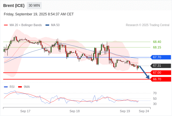 交易策略: 在 67.70 之下,看跌,目标价位为 67.00 ,然后为 66.70 。