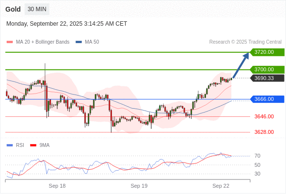 在 3666.00 之上,看涨,目标价位为 3700.00 ,然后为 3720.00 。