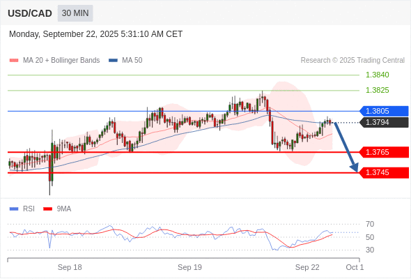 在 1.3805 之下,看跌,目标价位为 1.3765 ,然后为 1.3745 。