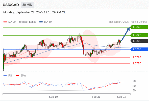 在 1.3785 之上,看涨,目标价位为 1.3820 ,然后为 1.3840 。
