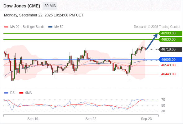 在 46605.00 之上,看涨,目标价位为 46830.00 ,然后为 46900.00 。