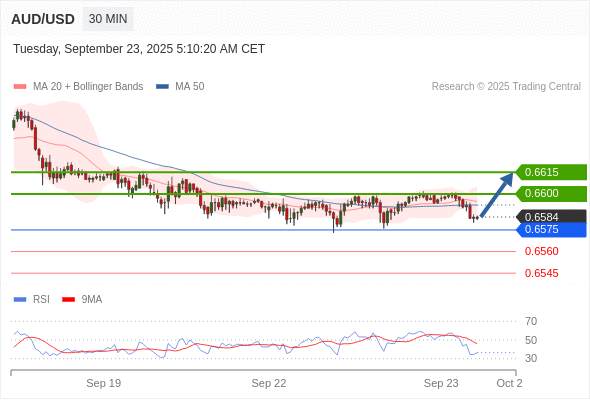 在 0.6575 之上,看涨,目标价位为 0.6600 ,然后为 0.6615 。