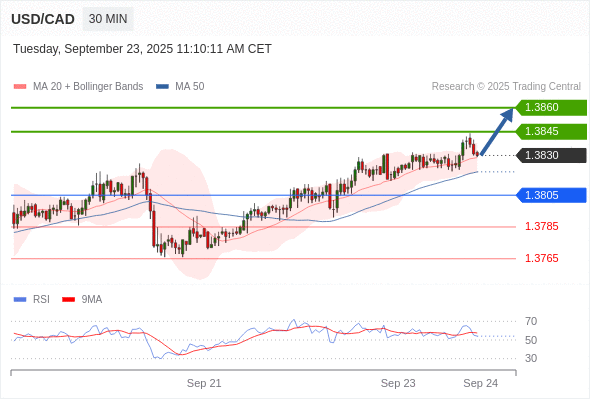 在 1.3805 之上,看涨,目标价位为 1.3845 ,然后为 1.3860 。