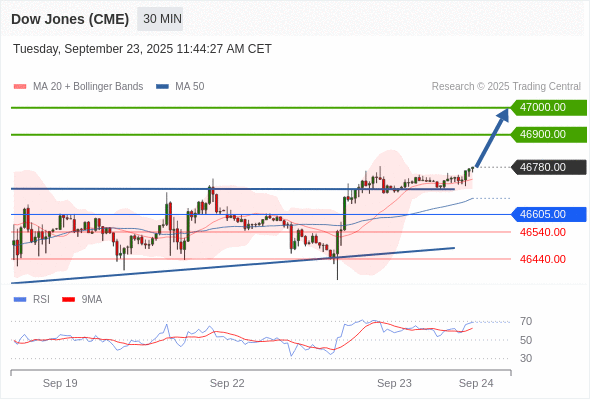 美国道琼斯指数期货 (Z5) 当日内: 目标位为47000.00。