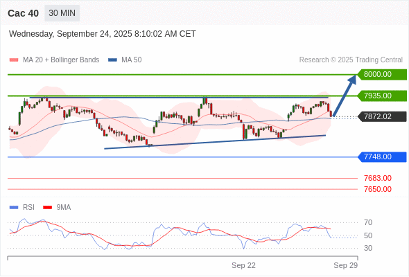 Cac 40 当日内: 在7748.00之上,看涨。