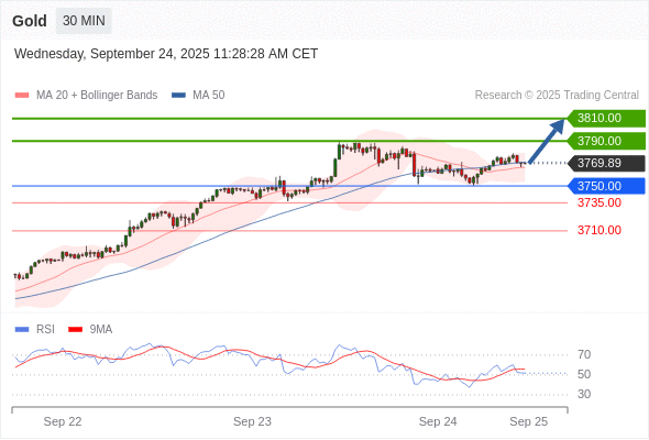 在 3750.00 之上,看涨,目标价位为 3790.00 ,然后为 3810.00 。