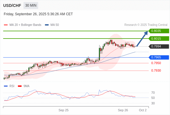 美元/瑞郎 当日内: 在0.7965之上,看涨。