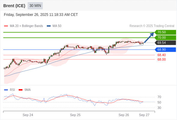 在 68.90 之上,看涨,目标价位为 70.00 ,然后为 70.50 。