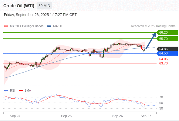 在 64.50 之上,看涨,目标价位为 65.70 ,然后为 66.20 。