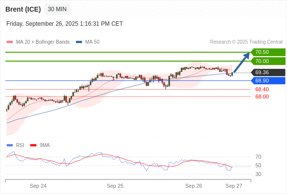 在 68.90 之上,看涨,目标价位为 70.00 ,然后为 70.50 。