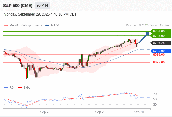 在 6705.00 之上,看涨,目标价位为 6745.00 ,然后为 6756.00 。