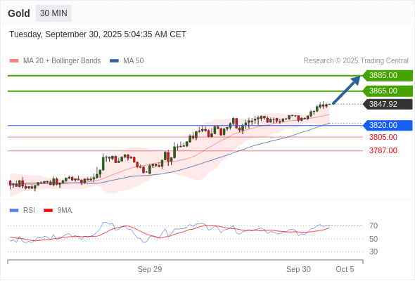 在 3820.00 之上,看涨,目标价位为 3865.00 ,然后为 3885.00 。
