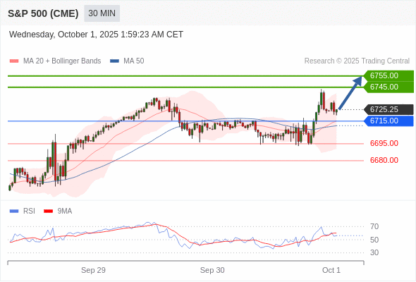 在 6715.00 之上,看涨,目标价位为 6745.00 ,然后为 6755.00 。