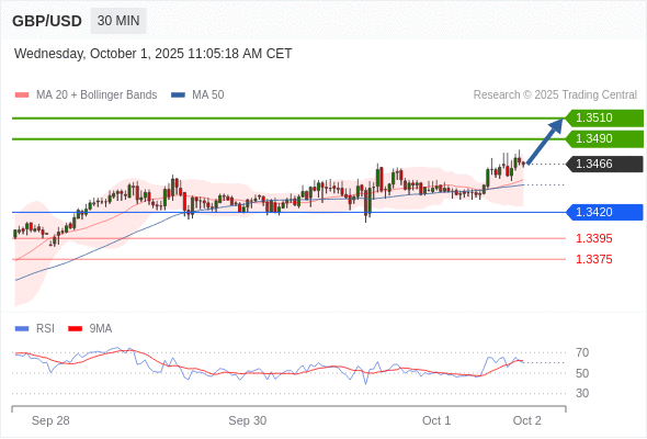在 1.3420 之上,看涨,目标价位为 1.3490 ,然后为 1.3510 。